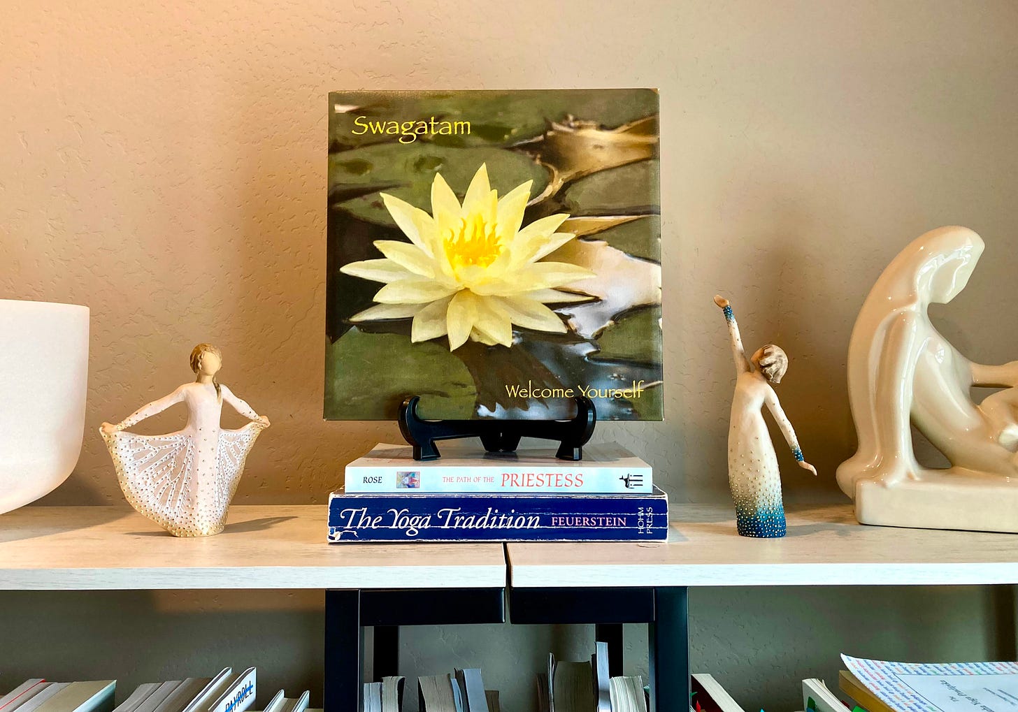 Carefully unwrapping the package, a pale-yellow lotus-seed cup filled with sun rays sits gracefully on a water pond. In the top left corner of the canvas wrap, the Sanskrit word Swagatam is spelled out in the gold of the flower’s center. In the bottom right corner, the translation, Welcome Yourself.